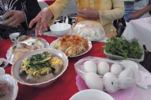 Những người trung niên bắt đầu đào bới trong các đĩa đồ ăn lớn, lôi ra những thứ có lẽ là ngon nhất cho vào chén của những người già hơn, một số người già sau khi nhận được miếng ngon bắt đầu cằn nhằn và lập tức chuyển chúng sang chén của mấy đứa con nít đang ngồi xung quanh.