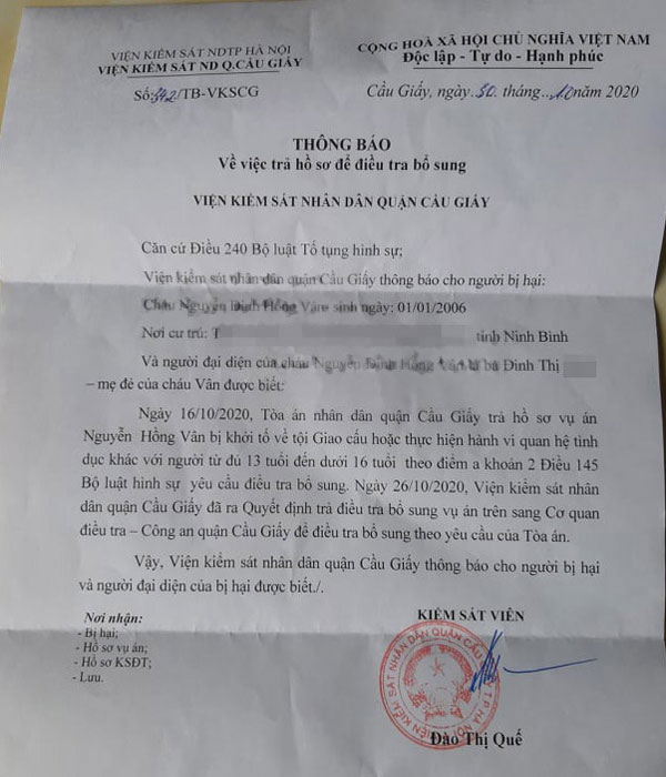Ngày 11/11, trao đổi với chúng tôi, chị Đinh Thị Mai (xin phép được thay đổi tên, quê ở Ninh Bình) cho biết, gia đình chị đã nhận được thông tin phía TAND quận Cầu Giấy (Hà Nộ) về việc trả hồ sơ cho cơ quan CSĐT Công an quận điều tra bổ sung vụ án "Giao cấu hoặc thực hiện hành vi quan hệ tình dục khác với người dưới 16 tuổi".