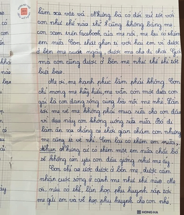 "... Con biết, bố mẹ không ở cạnh nhau nữa thì con làm gì có quyền đòi hỏi bố mẹ phải cùng đi họp cho con. Nhưng mẹ ơi, con ước ao một lần được mẹ đi họp phụ huynh cho con...".