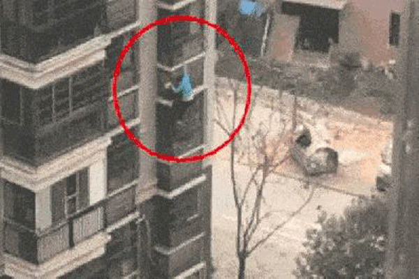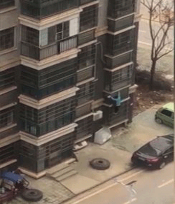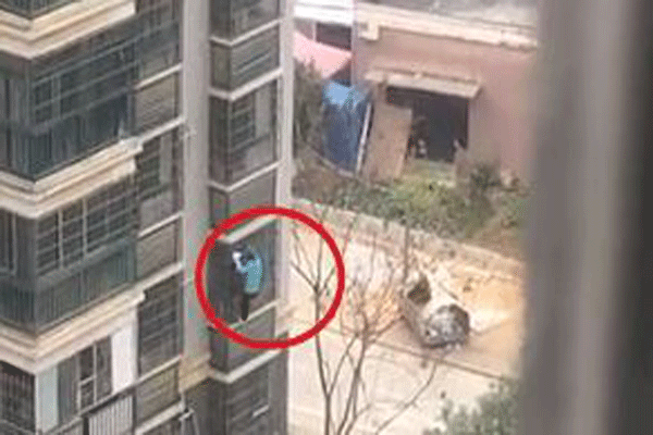Hôm 25/2, một phụ nữ 62 tuổi, được cho là mắc chứng tâm thần phân liệt, bị bắt gặp xách một chiếc túi đựng nồi mì ăn liền bám trên các gờ tường và ban công bên ngoài một chung cư ở quận Hoàng Bi, thành phố Vũ Hán.