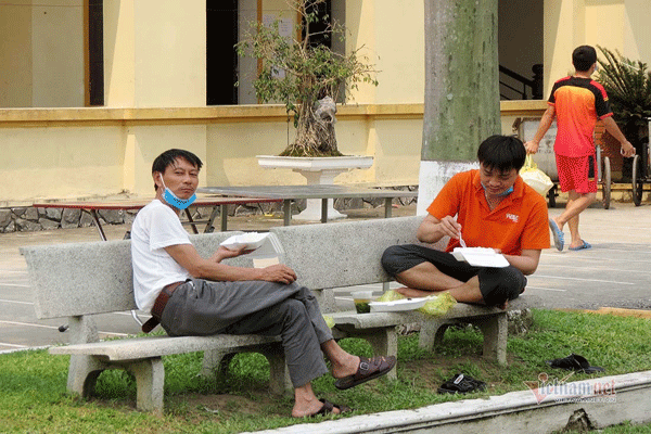 Anh Trần Khắc Tân (bên phải) ngồi ăn cơm trong khu cách ly