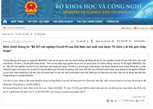 Trước đó, ngày 26/4/2020, Trung tâm Nghiên cứu & Phát triển Truyền thông KH&CN (thuộc Bộ KH&CN) đã phát đi thông tin về việc "Bộ kit xét nghiệm Covid-19 do Việt Nam sản xuất vừa được Tổ chức y tế thế giới chấp thuận". Bản tin này đồng thời được đăng tải trên Cổng thông tin chính thức của Bộ trong suốt hơn một năm, từ tháng 4/2020 tới 12/2021. Bản tin chỉ vừa mới được gỡ bỏ thời gian gần đây, trước khi có thông báo đính chính từ Bộ KH&CN.