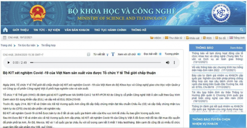 Căn cứ trên tổng hợp nguồn tin từ các cơ quan báo chí chính thống, vào lúc 15h36 ngày 26/4/2020, bản tin "Bộ KIT xét nghiệm Covid-19 của Việt Nam sản xuất vừa được Tổ chức Y tế thế giới chấp thuận" đã được đăng tải trên Cổng thông tin của Bộ KH&CN (www.most.gov.vn).