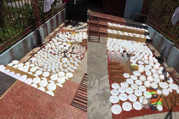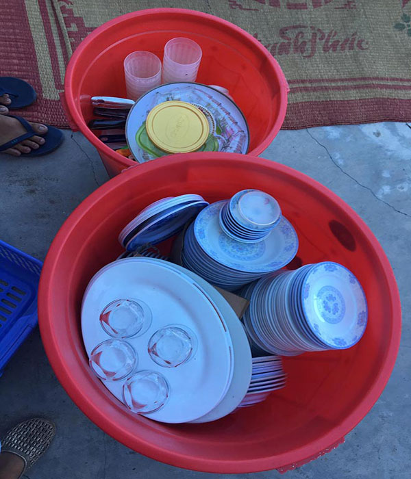 Người đàn ông ngồi rửa và phơi từng chiếc bát đĩa một.