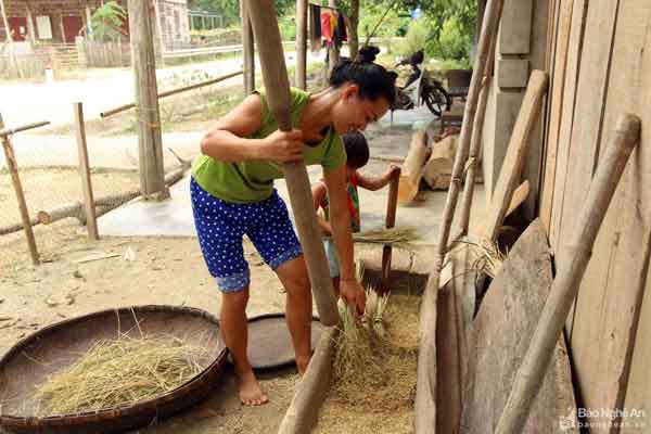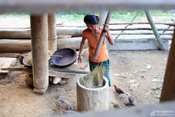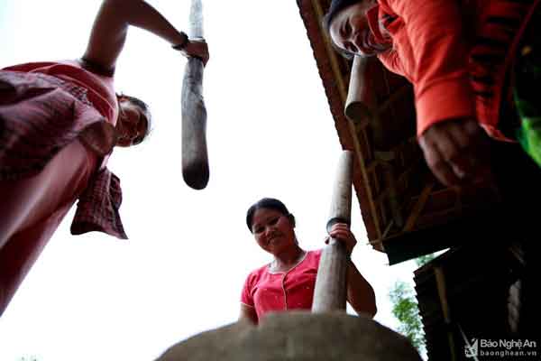 Việc giã gạo bằng cối rất vất vả, song nó là một nét trong sinh hoạt truyền thống đã được lưu giữ hàng trăm năm. Ảnh: Đào Thọ
