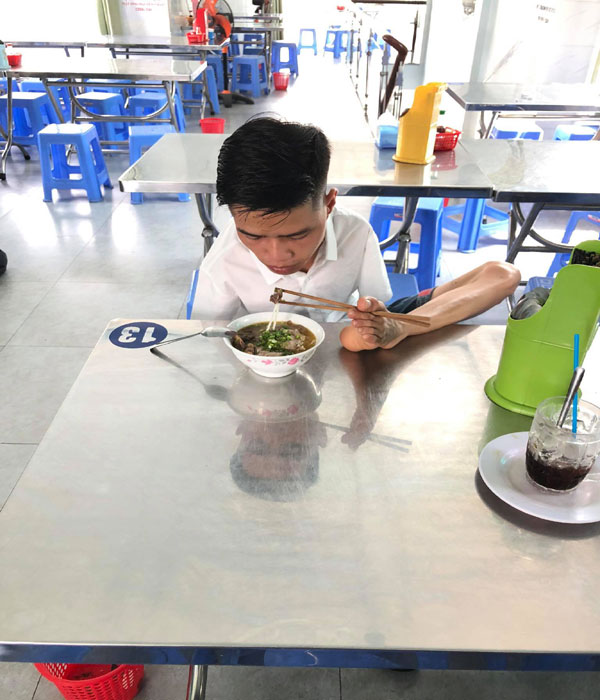 Mẹ chết lặng nhìn con không tay khi sinh ra. 2 tuổi dùng chân tự ăn uống, vào lớp 1 dùng chân để viết bài