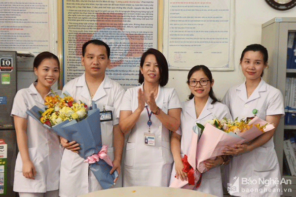 Khoa Xét nghiệm, Bệnh viện Sản Nhi Nghệ An tặng hoa cho 2 cán bộ sắp lên đường tăng viện cho Đà Nẵng. Ảnh: Hoài Giang