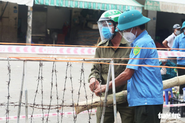 Lực lượng chức năng lập chốt phong tỏa chợ đầu mối Vinh - Ảnh: DOÃN HÒA