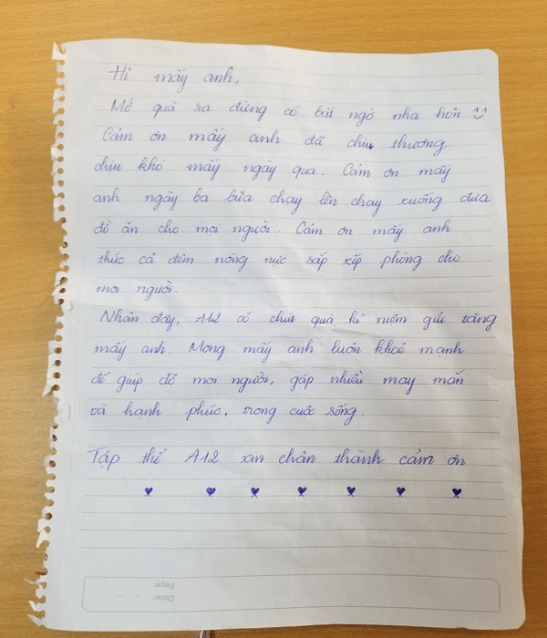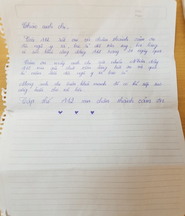 Đó là những chia sẻ của 1 trong 3 lá thư được đặt trong thùng quà mà các bác sĩ tìm thấy khi dọn dẹp khu cách ly ở block A12. Bác sĩ Lê Văn Phương đùa rằng may mà anh em mở ra kiểm tra, không thì cả thư cả quà đều “cuốn theo chiều… rác” hết.