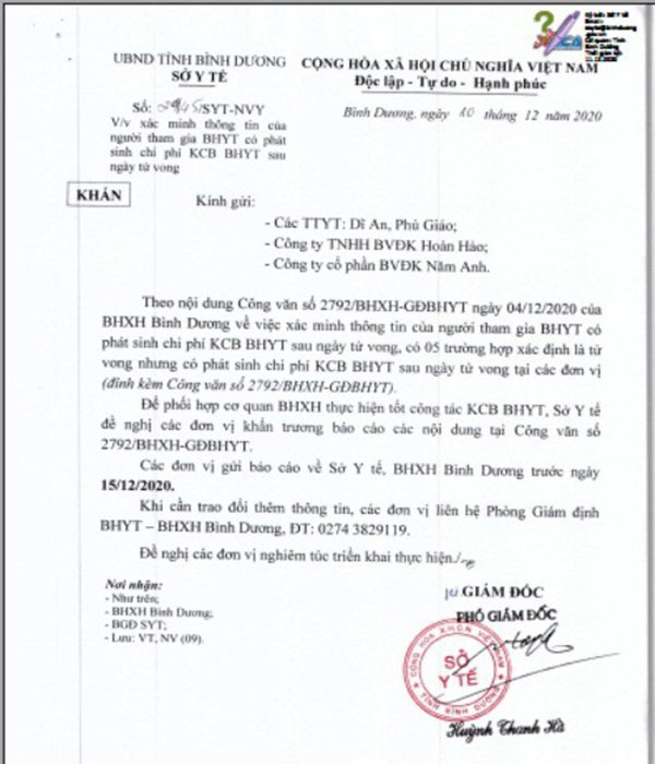 Công văn do lãnh đạo Sở Y tế Bình Dương ký ngoài việc đề nghị khẩn trương xác minh vụ việc còn chỉ đạo xử lý nghiêm các cá nhân liên quan đến quy trình tiếp nhận và điều trị bệnh để dẫn đến các sinh sót phát sinh chi phí khám chữa bệnh bảo hiểm y tế sau ngày tử vong.