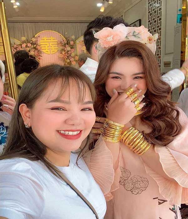 Theo những hình ảnh được đăng tải, cô dâu trẻ trong ngày cưới được người thân và bạn bè trao tặng số vàng cực khủng. Số vàng này bao gồm hàng chục kiềng, vòng tay cùng nhẫn vàng nặng trịch, đeo kín trên cổ và tay cô dâu cực "long lanh/lấp lánh/kiêu sa".