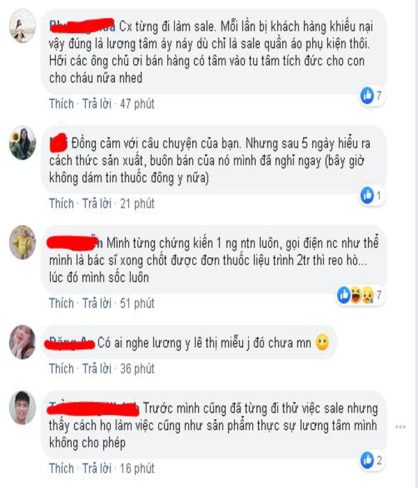 Chị ấy nói chị ấy ở quê, giá thuốc bên mình cao và nhưng chị tin mình nên đã phải bán đến cân thóc cuối cùng để mua thuốc. Chị ấy mắng mình rất lâu đòi trả tiền, đòi kiện ra tòa. Nhưng như mọi khi và như lời dặn của Leader là với những trường hợp này thì tắt máy, chặn số. Những lần tắt máy chặn số như thế này không biết mình đã làm bao nhiêu lần. Nhưng ngày hôm đó mình đã khóc và dằn vặt rất nhiều. Và mình xin nghỉ việc!