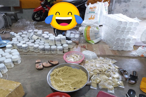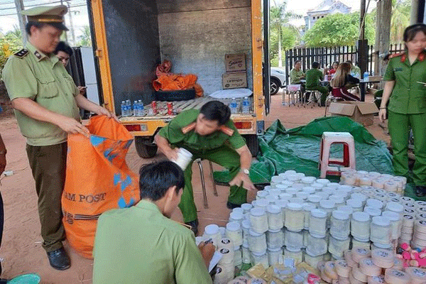 Khám xét nơi sản xuất mỹ phẩm của Nguyên, lực lượng chức năng phát hiện số tang vật vi phạm hành chính dùng để sản xuất kem trộn gồm: 03 kg nhãn hàng hóa in sẵn các loại để gắng vào sản phẩm kem trộn thành phẩm; 63 lọ/chai kem thành phẩm do nước ngoài sản xuất; 3,4 kg bột màu vàng, đen không có hóa đơn chứng từ và vật dụng dùng để sản xuất kem trộn, gồm: thau, cân đồng hồ, vá (muỗng), vỏ bao bì chứa nguyên liệu để sản xuất kem trộn. Trị giá tang vật tạm giữ ước tính trên 100.000.000 đồng.