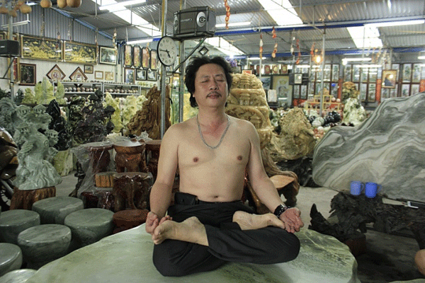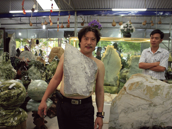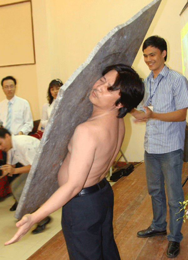 Ông là Tạ Quang Thanh, 55 tuổi, hiện là Phó giám đốc Cung Thiếu nhi TP.Hải Phòng. Chúng tôi gặp ông tại một cửa hàng bán đá phong thuỷ ở Q.Ngô Quyền, Hải Phòng và được xem “màn biểu diễn” hết sức ly kỳ của ông tại đây. Từng phiến đá từ nhỏ tới lớn được ông Thanh lau sạch trước khi đặt lên người và dang tay bước đi. Với những tảng đá lớn, phải có 2 người bê lên ốp vào ngực ông. Trước khi biểu diễn, ông ngồi tọa thiền và vận nội công, nhìn khá bí hiểm.