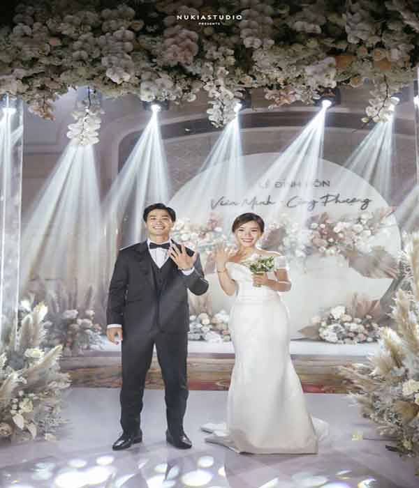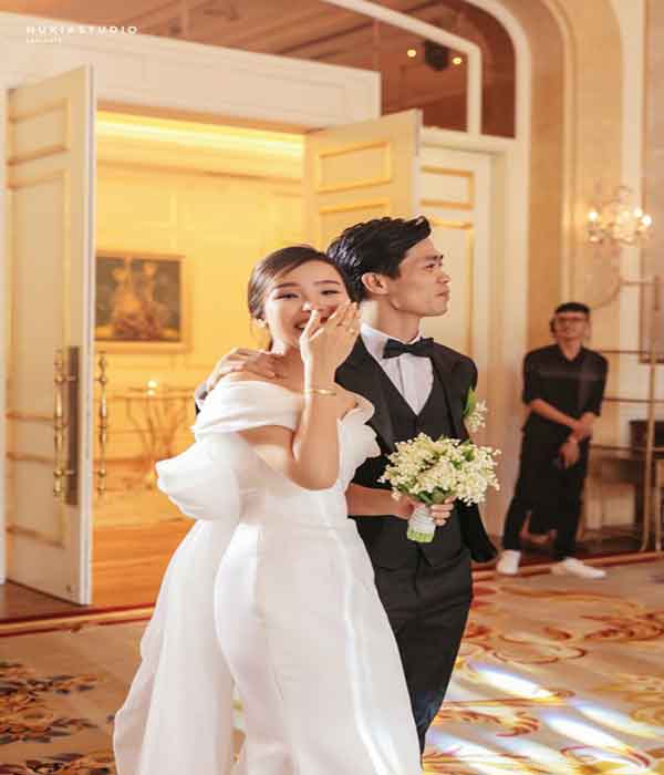 Đến phần tiệc được tổ chức tại khách sạn, Viên Minh xinh đẹp, dịu dàng như một nàng công chúa trong chiếc váy cưới màu trắng. Còn Công Phượng thì xuất hiện với bộ vest đen chỉn chu và vô cùng bảnh bao. Cả hai cùng đứng trên lễ đường trong giờ phút thiêng liêng, tận hưởng những giây phút vừa hạnh phúc, vừa xúc động.