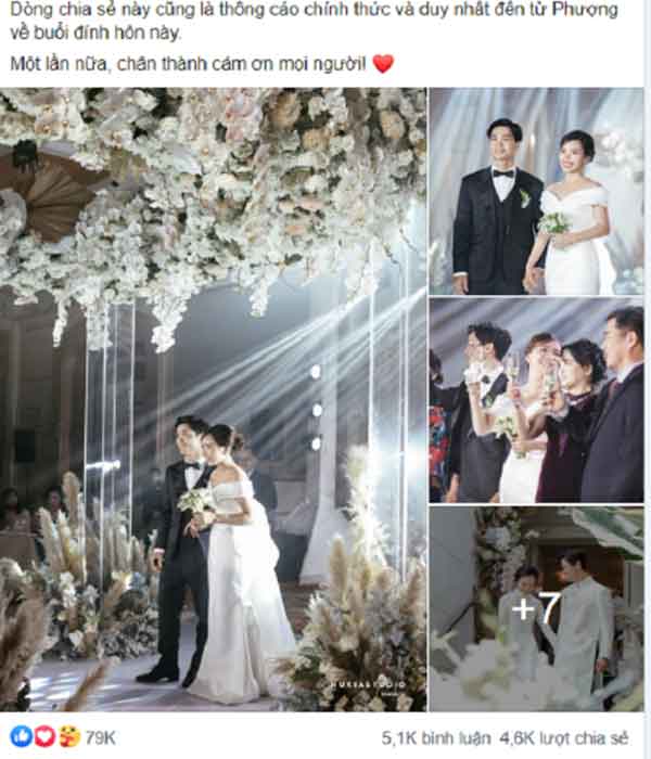 Loạt ảnh được chia sẻ kèm dòng trạng thái: "Thoạt đầu, Phượng và Minh dự định làm lễ đính hôn ấm cúng 100 người, chỉ dành riêng cho gia đình và bạn bè thân thiết của hai bên. Đồng nghĩa với việc không chia sẻ vấn đề này với báo chí.