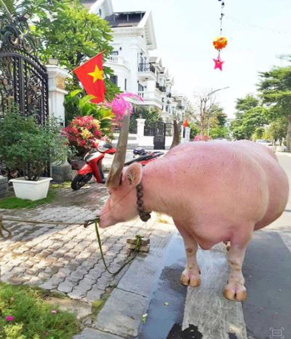 Chú trâu hồng "du xuân" gây chú ý sáng nay.