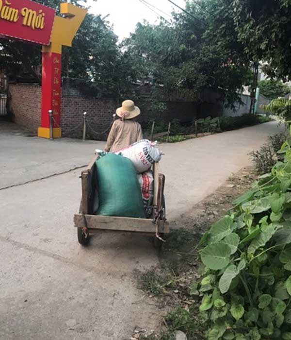 Dù bên tay gãy chưa lành nhưng bà vẫn cố kéo xe chở những bao gạo về nhà.