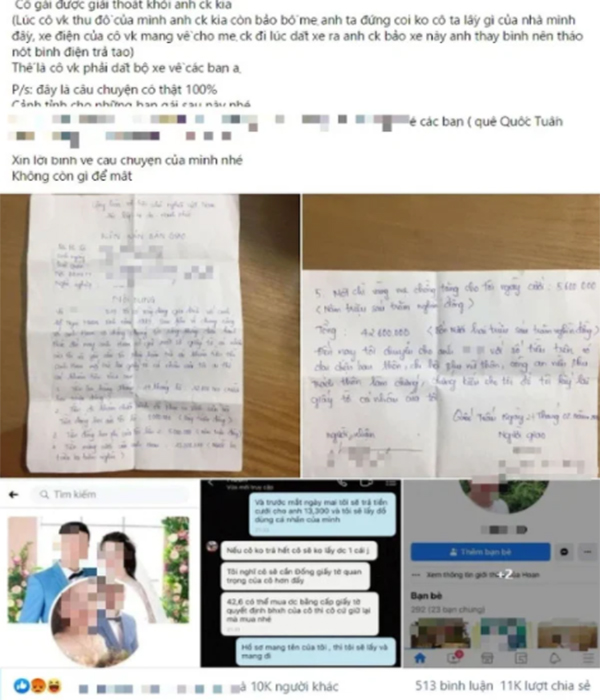 Một người chia sẻ câu chuyện lên mạng với dòng trạng thái: "Câu chuyện kể về một người phụ nữ đi lấy chồng không có tiền bạc của cải mang về nhà chồng. Kết hôn với chồng được 1 năm vì mâu thuẫn cô vợ không thể tiếp tục sống với anh chồng kia được nữa và cô ấy chọn cách ra đi.