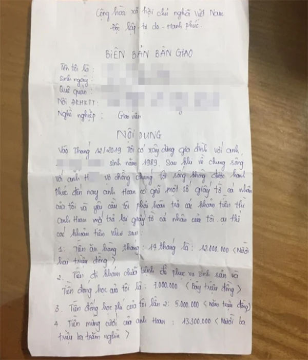 Đăng tải kèm với dòng chia sẻ là các "Biên bản bàn giao" có chữ ký 2 bên và tin nhắn của 2 vợ chồng. Trong biên bản, cô vợ ghi rõ:
