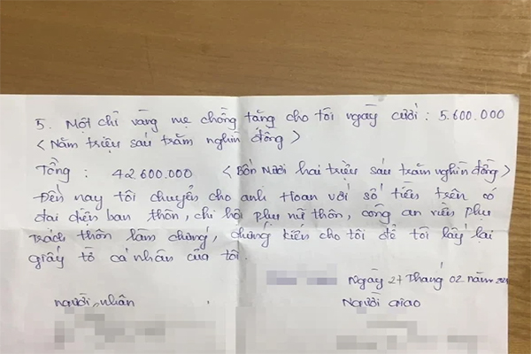 Biên bản bàn giao tiền và vàng cưới của người vợ, phía dưới có chữ ký của người nhận là người chồng tên H.