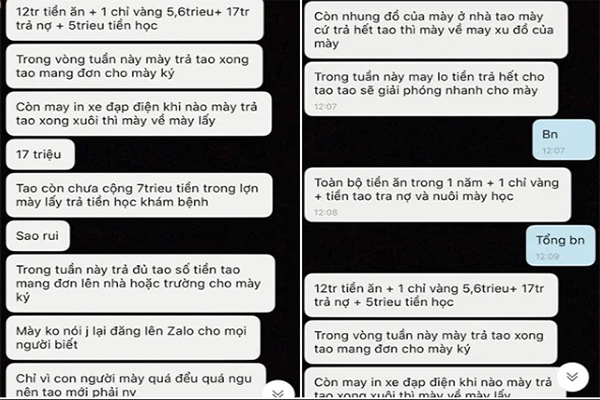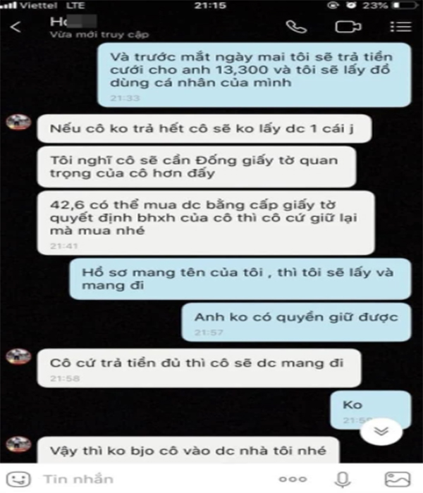 Trong tin nhắn giữa 2 vợ chồng, người chồng còn nhấn mạnh: "Cô cứ trả đủ tiền thì cô sẽ được mang đi... Vậy thì cô không bao giờ được vào nhà tôi nữa nhé".