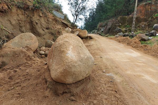 Dù đã khắc phục tạm thời cho phương tiện lưu thông nhưng nhiều khối đá lớn vẫn còn nằm lại ven đường, cản trở giao thông.