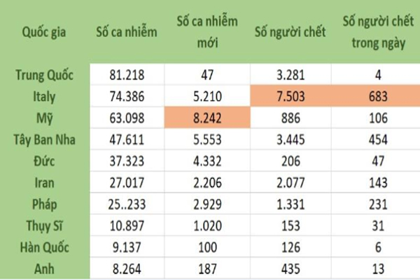 Italy và Mỹ vẫn là hai tâm dịch hiện tại. Mỹ tiếp tục là nước có số ca nhiễm mới nhiều nhất thế giới trong 24 giờ qua (8.242 trường hợp).