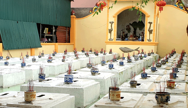Những ngôi mộ cá Ông (cá voi) được táng tại đền. Là tín ngưỡng của ngư dân Nghi Hải, nét đẹp trong văn hóa tâm linh mang tính nhân bản, hướng con người đến cuộc sống tốt đẹp, đầy ắp tình người. Ảnh: N.D