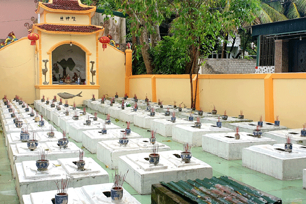 Mỗi khi gặp cá voi mắc nạn, họ lập tức dùng hết khả năng để cứu sống, đưa cá voi trở về biển cả. Mỗi khi phát hiện cá voi lụy, ngư dân tìm cách đưa vào bờ và tổ chức mai táng chu đáo. Theo quy ước, người phát hiện cá Ông lụy đầu tiên được xem là người được Ông tín nhiệm, do đó được vinh hưởng chức trưởng nam. Người này được mệnh danh là con Ông Nam Hải nên trong đám tang phải bịt khăn điều và chịu tang như con chịu tang cha mẹ vậy. Khi phát hiện Ông lụy, người ta tìm cách dìu xác Ông vào bờ, và vạn trưởng huy động dân chài đưa Ông lên bờ để làm lễ an táng. Trường hợp gặp phải xác cá ông quá lớn thì người ta dùng đăng quàng lại, cử người canh giữ cho đến khi thịt rã hết mới lấy bộ xương đưa lên lăng thờ. Thời Nguyễn, còn có quy định, làng nào bắt gặp cá Ông chết thì lý trưởng phải trình lên phủ, huyện để quan cho lính về khám định, cấp tiền tuất, hương đèn, vải đỏ quấn đủ 7 vòng và cho khâm liệm, cấp đất xây lăng và ruộng hương hỏa để thờ. Đủ hai năm thì cải táng, lấy xương xếp vào quách, khạp đưa vào khu nghĩa trang cạnh đền Làng Hiếu để thờ. Khu nghĩa trang hiện nay có 85 ngôi mộ “cá Ông” được xây bằng xi măng, phía dưới vẫn còn xương cốt. Trong lăng chính được xây, lợp mái là phần mộ thờ thần cá tương truyền là cá Ông đầu tiên được an táng tại đền từ thế kỷ 19. Trong lăng có đặt bệ thờ, chính giữa là bài vị thần Ngư, phía sát mái có đề 3 chữ Hán “Lăng Thần Ngư”.