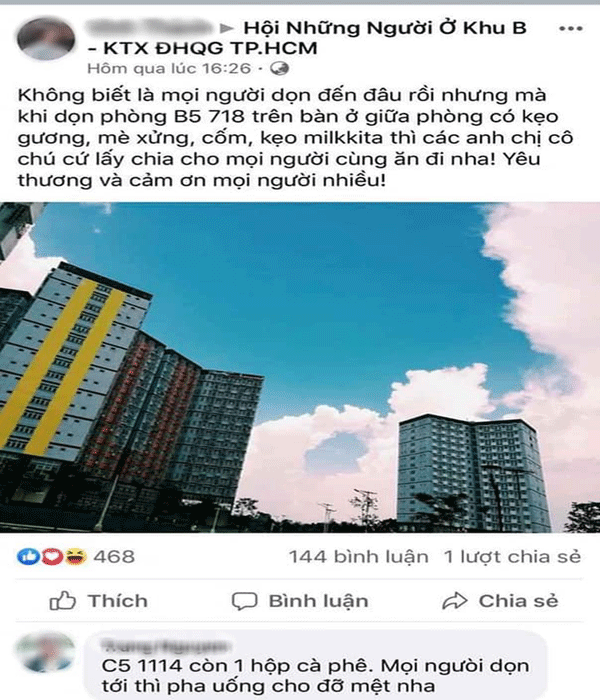 Cuối cùng, một lần nữa, mong mọi người hãy quên căn phòng tồi tàn của mình đi. Hãy nhớ về những anh bộ đội, các bác sĩ và chính phủ Việt Nam đang nỗ lực thế nào. Đặc biệt những ai đang trú chân ở ngôi nhà thứ 2 của bọn mình, mong mọi người sức khỏe và hiểu biết. KTX sẽ sớm bình an, Việt Nam sẽ chiến thắng!".