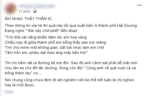 Mới đây trên một diễn đàn mạng xã hội chia sẻ bài viết một cô gái, do mải chill theo nên quên hết đường về, phải nhờ mấy anh công an tới đón đưa, nhiều người chứng kiến đã tự tin rằng âm nhạc có thể gắn kết mọi người với nhau... thậm chí cả giữa buổi đêm ngoài đường đông người.