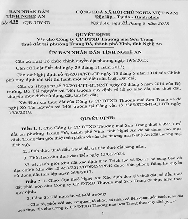 Theo các quy định liên quan của Luật Đất đai 2013, Nghị định 43/2014/NĐ-CP của Chính phủ và Quyết định 72/2017/QĐ-UBND ngày 28/11/2017 của UBND tỉnh Nghệ An thì quy trình thực hiện “trao” quyền sử dụng đất cho Cty Sơn Trang thực hiện dự án nói trên đang có nhiều vấn đề chưa được làm rõ.