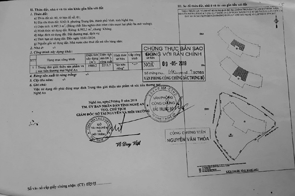 Tiếp đó, đến ngày 27/6/2018, Sở TN&MT tỉnh Nghệ An đã cấp giấy chứng nhận quyền sử dụng đất, quyền sở hữu nhà ở và tài sản khác gắn liền với thửa đất có mã số CM 076547 để Cty Sơn Trang “khép kín” các quy trình tiếp theo.
