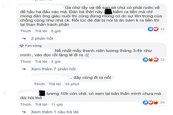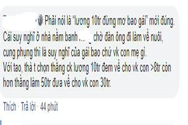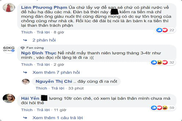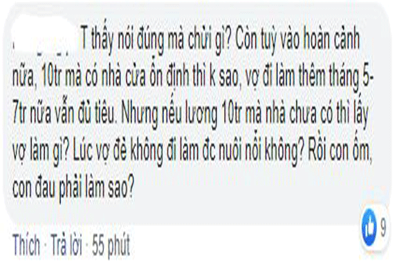 Phản bác lại ý kiến này, nhiều người cho biết tư tưởng “đàn ông lương 10 triệu không cưới được vợ” chỉ là cái cớ của những cô gái biếng làm, thích dựa dẫm vào đàn ông. Mặc dù việc nhà là việc không tên, thế nhưng sáng chiều đi làm, tối về 2 vợ chồng chia nhau việc nhà là điều hoàn toàn có thể. Bên cạnh đó, có một cô gái còn tuyên bố gây S. ố c hơn là :”mây tầng nào gặp mây tầng đó, chị nào đòi chồng lương 20 triệu trở lên thì phải nhìn lại xem mình có đủ “tiêu chuẩn” để người ta bỏ tiền ra nuôi mình hay không?”. ” Lấy vợ chứ đâu phải lấy của nợ về để hầu hạ ?” Một cư dân mạng bữ xúc bình luận.