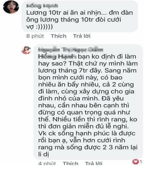 Trước câu hỏi đặt ra “Đàn ông lương 10 triệu có nên cưới vợ?” đã có hai luồng ý kiến trái chiều xung đột lẫn nhau gây ra cuộc tranh cãi không hồi kết trên mạng xã hội. Một bộ phận các cô gái theo đuổi tư tưởng “bình đẳng”, “tự do” cho biết, họ không cần một người chồng lương vài chục triệu một tháng.