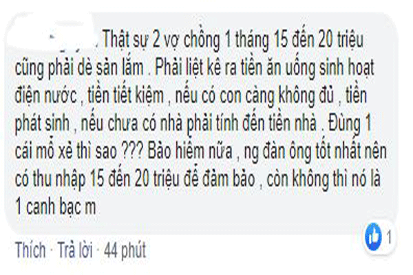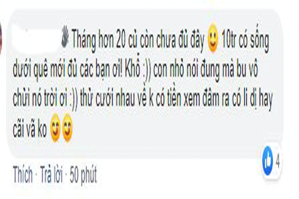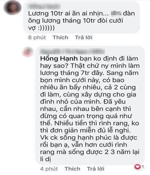 Chủ đề này đã thu hút hơn 3000 bình luận trên mạng xã hội và chưa có dấu hiệu dừng lại. Bởi lẽ, ai cũng có cái lý riêng của mình. Quay trở lại vấn đề “Đàn ông lương 10 triệu có lấy được vợ hay không?”, thực ra, việc lương bao nhiêu tiền không mấy ảnh hưởng đến việc cưới vợ hay không. Quan trọng là, hai người có thực sự muốn lấy nhau hay không mà thôi.