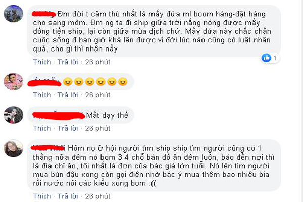 "Không phải hại 1 người mà cùng lúc hại nhiều người, trời nắng mà các anh shipper phải đi chờ đợi mua hàng đem giao nhưng lại bị boom, vừa tiền vừa công." - chủ nhân bài viết T.T chia sẻ