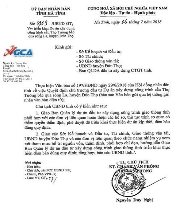 Văn bản triển khai Dự án xây dựng cầu Thọ Tường của UBND tỉnh Hà Tĩnh (ảnh tư liệu)
