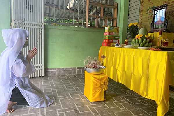 Nữ nhân viên y tế lập bàn thờ chịu tang mẹ ở vùng phong tỏa. Ảnh: CTV