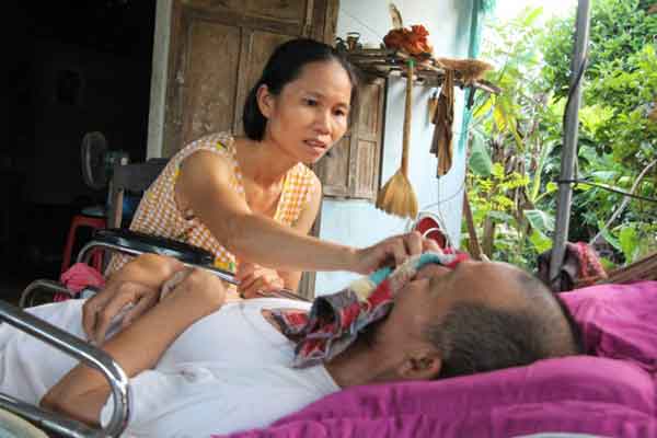 Giờ đây, anh chỉ nằm một chỗ, không nhận thức được mọi thứ xung quanh. Từ bữa cơm, giấc ngủ, đến vệ sinh cá nhân đều trông nhờ vào bàn tay của người vợ.
