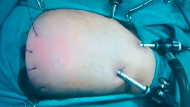 Bệnh nhân được tiến hành phẫu thuật nội soi giải phóng tạng thoát vị đưa trở lại ổ bụng, khâu phục hồi cơ hoành. Trong mổ, các bác sĩ thấy tạng thoát vị lên lồng ngực bao gồm ruột non, ruột già, lách gây thiểu sản phổi và tăng áp lực động mạch phổi trái.