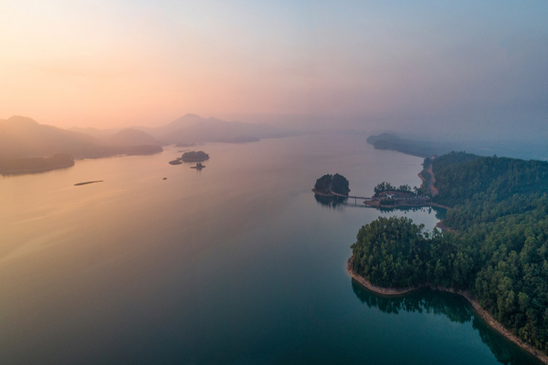 Đứng từ trên cầu ngắm nhìn ra xa khung cảnh trời đất thơ mộng, xa xa kia là những ốc đảo lớn nhỏ thấp thoáng trên mặt hồ, du khách như được lạc vào thế giới thần tiên huyền bí đến kì lạ.