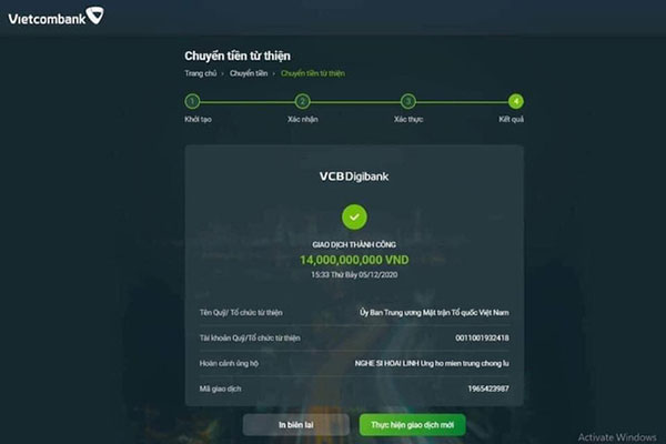 Tin nhắn chuyển tiền từ thiện (giả) trước đó các nghệ sĩ tung ra để đánh lạc hướng dư luận.