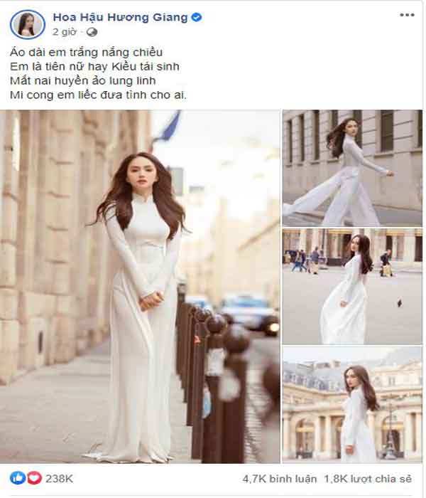 Đi kèm bộ ảnh, Hương Giang còn không ngần ngại để dòng chú thích đậm mùi "thả thính": "Áo dài em trắng nắng chiều, em là tiên nữ hay Kiều tái sinh. Mắt nai huyền ảo lung linh, mi cong em liếc đưa tình cho ai".