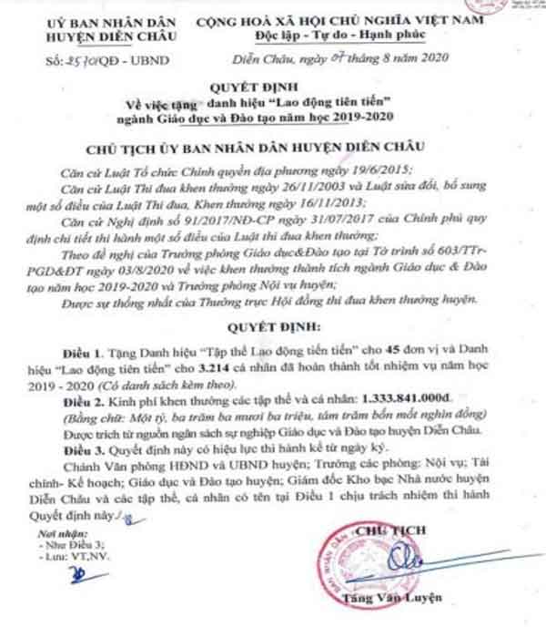 Cụ thể, ngày 7/8, UBND huyện Diễn Châu có Công văn số 2570/QĐ-UBND Quyết định về việc tặng danh hiệu “Lao động tiên tiến” ngành GD-ĐT năm học 2019 - 2020. Trong đó, tặng danh hiệu “Tập thể Lao động tiên tiến” cho 45 đơn vị và danh hiệu “Lao động tiên tiến” cho 3.214 cá nhân đã hoàn thành tốt nhiệm vụ năm học 2019 - 2020. Tổng kinh phí khen thưởng hơn 1,3 tỷ đồng. Hiện số tiền này đã cấp về cho các trường khen thưởng cho giáo viên năm học 2019 - 2020.
