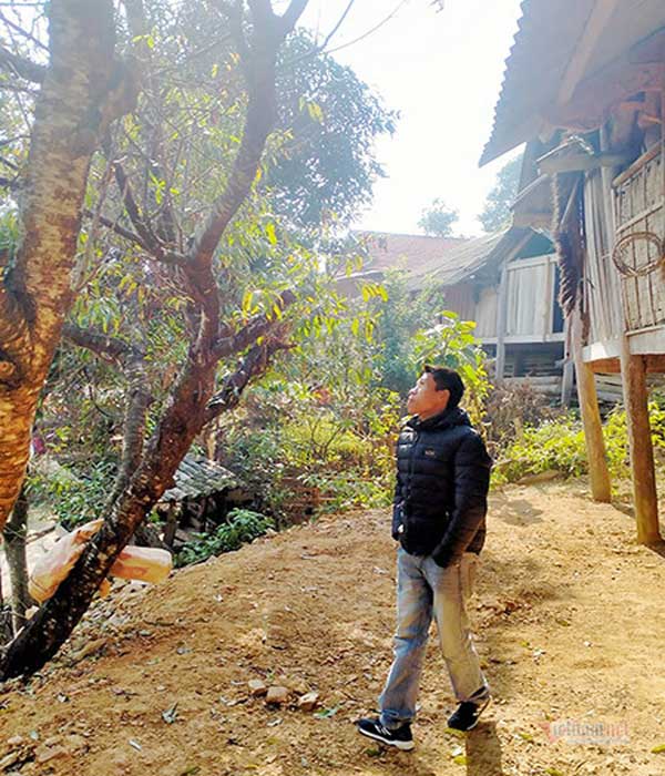Anh Đậu Xuân Đồng bên gốc đào cổ thụ được trồng sát nhà dân ở xã Bảo Nam, huyện Kỳ Sơn, Nghệ An