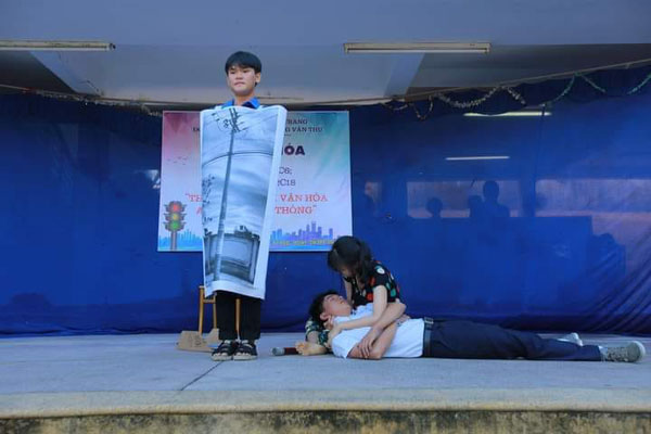 Tuy vậy, nếu sau này nhớ lại những khoảnh khắc chỉ xảy ra một lần trong đời này, hẳn ai cũng sẽ tủm tỉm cười vì thời học trò nhiều kỷ niệm đẹp. Mới đây, trên mạng lại phát sốt với hình ảnh được chụp lại trong một buổi ngoại khóa về văn hóa giao thông tại THPT Hoàng Văn Thụ, Nha Trang, Khánh Hòa. Theo đó, một nhóm học sinh vào vai để đóng một hoạt cảnh minh họa cho chủ đề của buổi ngoại khóa, trong đó, xuất hiện một nhân vật cực kỳ đặc biệt.