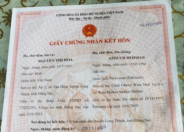 Giấy chứng nhận kết hôn của bà Hoa và người chồng ngoại quốc. (Ảnh: Báo Lao động)
