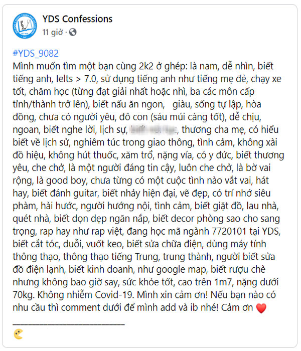 Không biết nam sinh này thật thà hay vui tính mà còn yêu cầu người ở ghép phải có hiểu biết lịch sử, nghiêm túc trong giao thông, giàu nhưng không xài đồ hiệu. Loạt những gạch đầu dòng khác thì không khác gì tuyển người yêu như như biết thương yêu, che chở, đáng tin cậy, là bờ vai rộng, tóm lại là một good boy và chưa có mảnh tình nào vắt vai. Thêm quả phải có loạt tài lẻ từ đàn ca sáo nhị đến nhảy nhót, siêu trí nhớ, decor phòng, biết rap,... và thầu luôn những công việc nhà. Ngoài ra còn rất rất nhiều những đề nghị khác mà kể mãi cũng không hết.